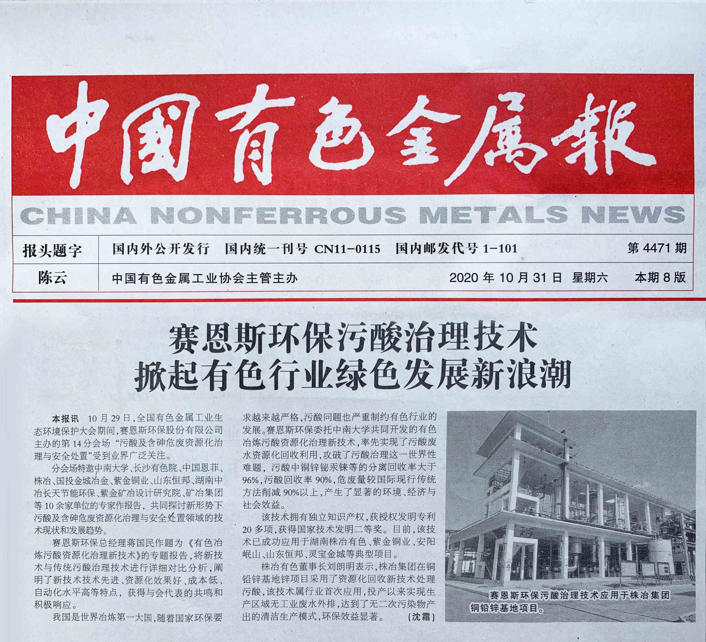 中国有色金属报报道-赛恩斯环保污酸治理技术 掀起有色行业绿色发展新浪潮